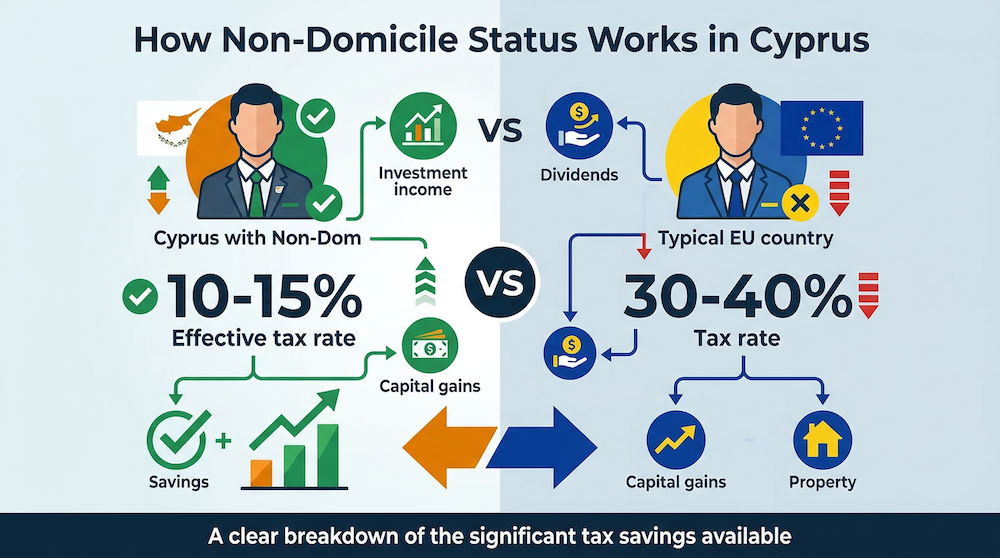 Cyprus’s Non-Domicile (“Non-Dom”) regime is a game-changer for international investors. It exempts foreign-sourced income, such as dividends and interest, from taxation for 17 years. This is complemented by one of the EU’s lowest corporate tax rates at 12.5% and a complete absence of inheritance tax. For a high-net-worth individual, this framework can result in tens of thousands of euros in tax savings annually compared to other European jurisdictions.