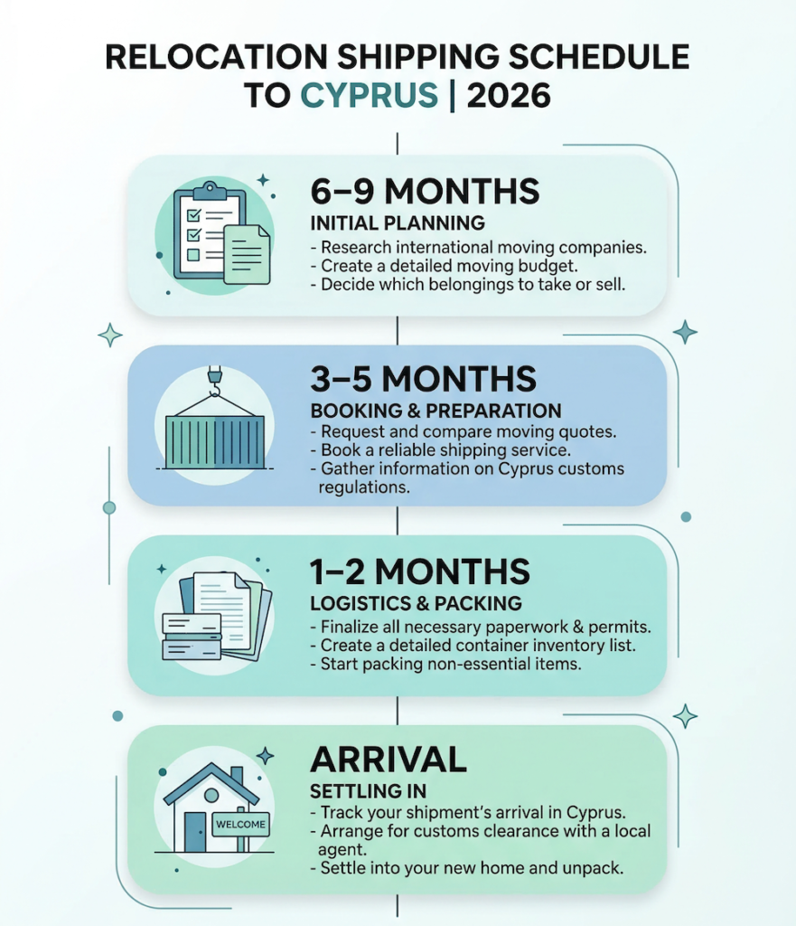 Your moving journey, simplified: The process of shipping belongings to Cyprus is a marathon, not a sprint. We break it down into four manageable phases. Phase 1 (6-9 months before your move) is about foundational research, serious decluttering, and gathering initial quotes. Phase 2 (3-5 months out) involves locking in your international mover and finalizing your inventory. Phase 3 (1-2 months out) is dedicated to meticulous packing and preparing all customs paperwork. Finally, Phase 4 (Arrival) covers customs clearance at the port and the final delivery to your new Cypriot home.